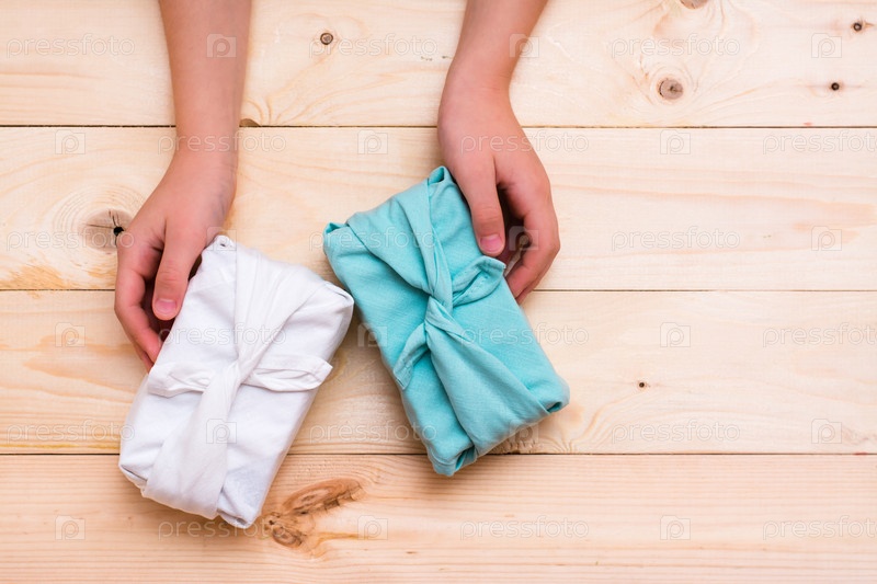 Фурошики экологически чистые подарки, завернутые в ткань и детские руки на деревянном фоне. Ноль отходов. Вид сверху