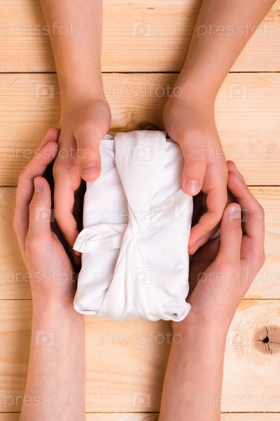 Фуросики экологически чистые подарки, завернутые в ткань в нежных детских руках на деревянном фоне. Ноль отходов. Вид сверху