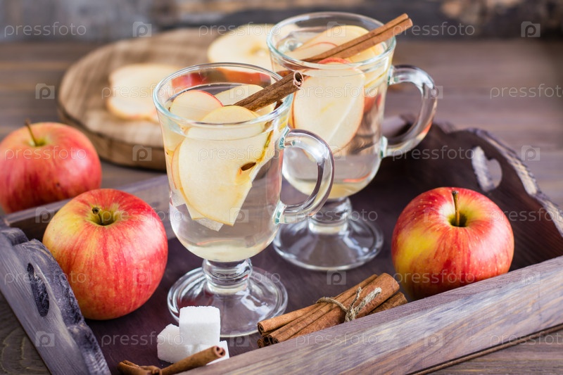 Теплый успокаивающий чай из яблок и корицы в стаканах и ингредиенты для приготовления пищи на деревянном столе. Концепция детоксикации, антидепрессант. Деревенский стиль