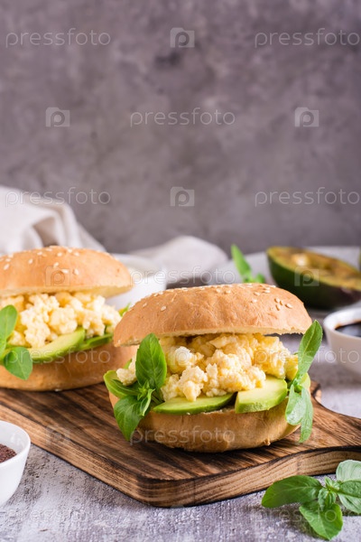 Вкусный бутерброд с яичницей, авокадо и базиликом на доске. Здоровая пища. Вертикальный вид