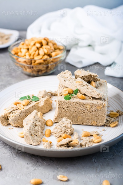Кусочки подсолнечной и арахисовой халвы и листья мяты на тарелке и миска орехов на столе. Калорийное восточное лакомство. Вертикальный вид. Крупный план