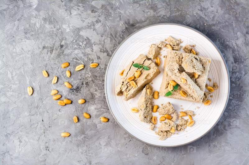 Кусочки подсолнечной и арахисовой халвы и листьев мяты на тарелке и орехи рядом на столе. Калорийное восточное лакомство. Вид сверху