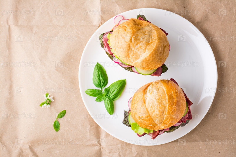 Готовые к употреблению гамбургеры с пастрами, овощами и базиликом на тарелке на крафт-бумаге. Американский фаст-фуд. Вид сверху