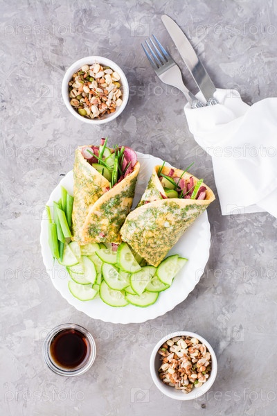 Яичные рулетики с пастрами, овощами и зеленым луком на тарелке, пророщенные зерна и соевый соус в мисках на столе. Сытный и калорийный перекус. Верхний и вертикальный вид