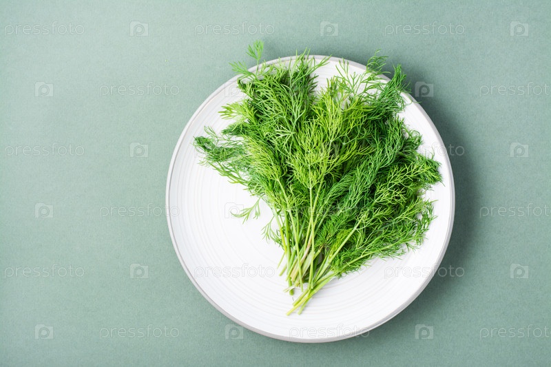 Куча свежего укропа на тарелке на зеленом фоне. Витаминная зелень в здоровом питании. Вид сверху