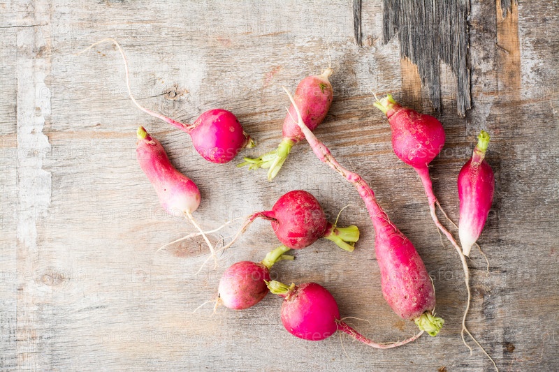 Свежий слегка заросший редис на деревянном столе. Овощи для вегетарианской диеты. Деревенский стиль. Вид сверху
