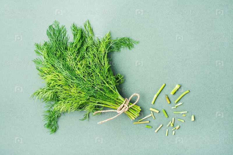 Пучок свежего укропа и срезанные концы стеблей на зеленом фоне. Витаминная зелень в здоровом питании. Вид сверху
