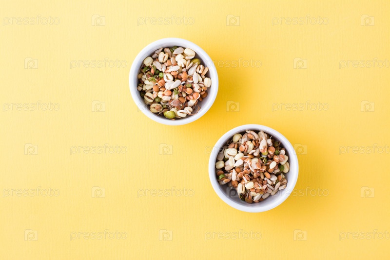Проросшие зерна бобов мунг, чечевицы, льна и подсолнечника в мисках на желтом фоне. Вид сверху. Копировать пространство