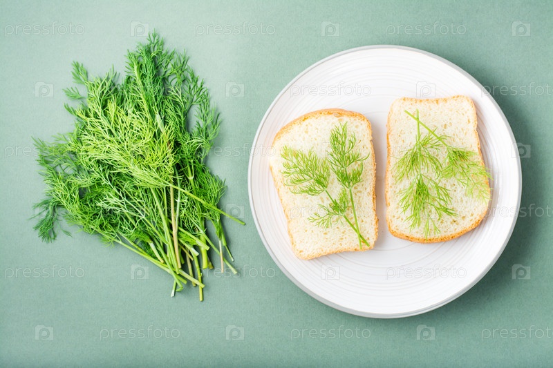Бутерброды с белым хлебом и свежим укропом на тарелке и пучок укропа на зеленом фоне. Витаминные травы в здоровом питании. Вид сверху