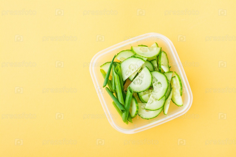 Нарезанный свежий огурец и зеленый лук в коробке на желтом фоне. Еда на вынос, школьный завтрак. Вид сверху