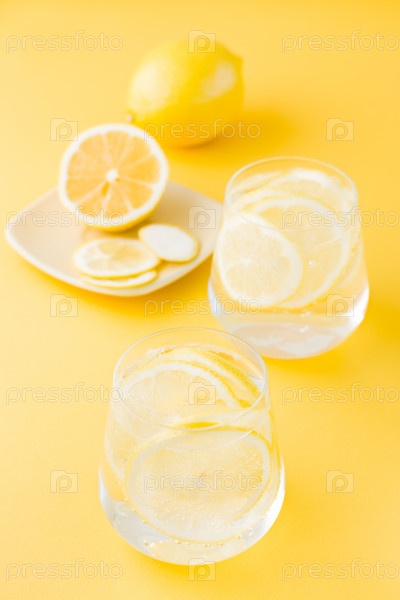 Газированная вода с лимоном и льдом в стаканах и дольками лимона на блюдце на желтом фоне. Детокс напиток. Вертикальный вид