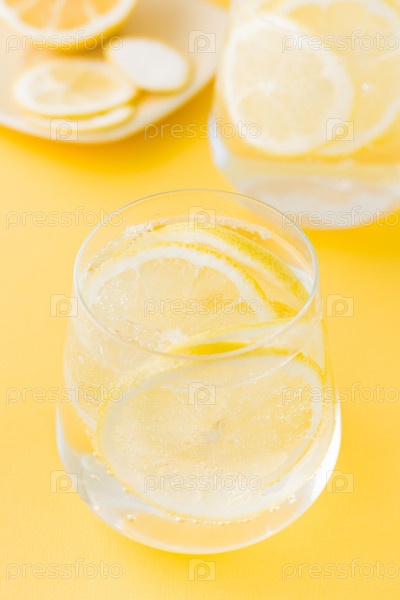 Газированная вода с лимоном и льдом в стаканах на желтом фоне. Детокс напиток. Вертикальный вид
