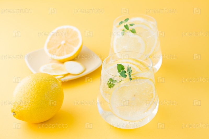 Газированная вода с лимоном, мелиссой и льдом в стаканах и дольками лимона на блюдце на желтом фоне. Алкогольный напиток крепкий зельтер