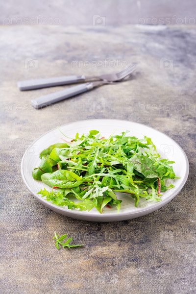 Смесь свежих листьев рукколы, мангольда и мизуна на тарелке и вилок на столе. Вегетарианство, здоровое питание. Вертикальный вид