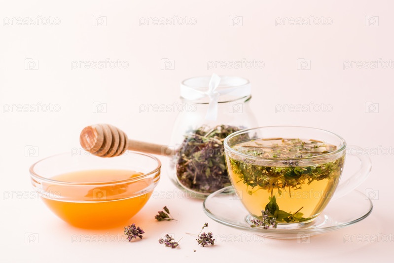Свежий горячий чай с орегано в чашке, мед в миске и сухая трава в банке. Фитотерапия и альтернативная терапия