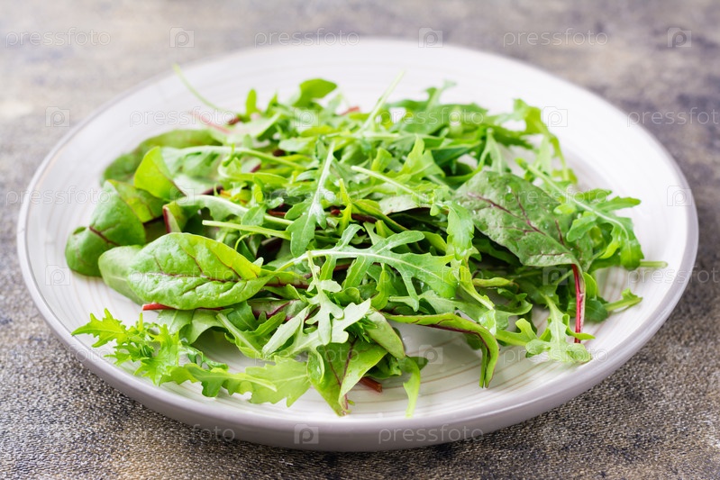 Смесь свежих листьев рукколы, мангольда и мизуна на тарелке на столе. Вегетарианство, здоровое питание. Крупный план