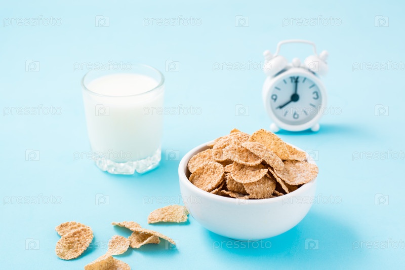 Миска хлопьев, стакан молока и будильник на синем фоне. Запланированный завтрак