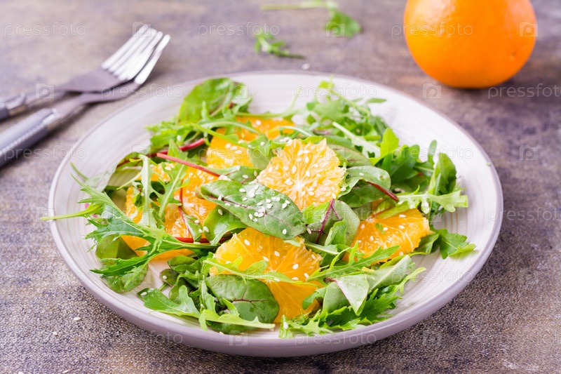 Диетический вегетарианский витаминный салат из кусочков апельсина и смеси листьев рукколы, мангольда и мизуна на тарелке на столе. Крупный план