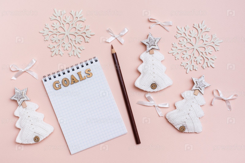 Годовые цели. Блокнот, карандаш и Рождество ручной работы на пастельном фоне. Вязаные елочки