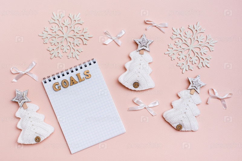 Годовые цели. Блокнот и Рождество ручной работы на пастельном фоне. Вязаные елочки