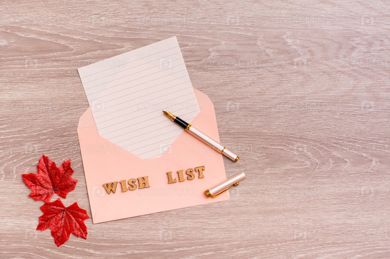 Список желаний. Чистый лист бумаги для письма в конверте и перьевая ручка на деревянном фоне. Вид сверху