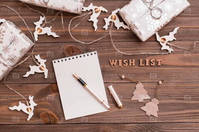 Список желаний. Блокнот, перьевая ручка, подарки и гирлянда на деревянном фоне. Вид сверху