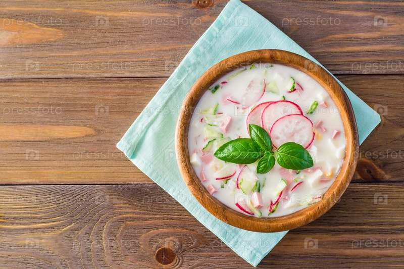 Национальное русское блюдо – окрошка. Холодный суп с овощами и зеленью на кефире. Деревенский стиль. Вид сверху