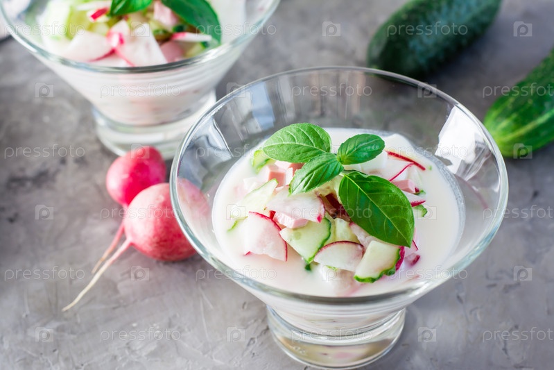 Национальное русское блюдо – окрошка. Холодный суп с овощами, сосисками и зеленью на кефире в стеклянных мисках на столе. Крупный план