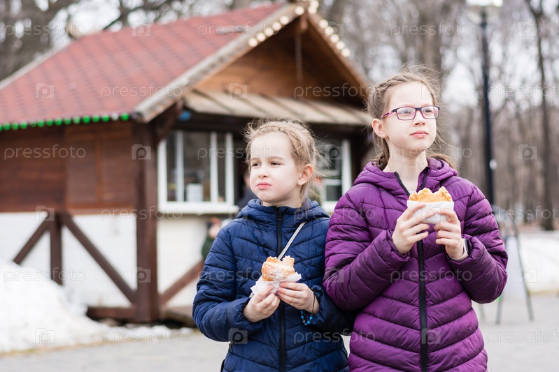 Две девочки-сестры едят пироги, купленные в фургоне с едой в городском парке. Еда на вынос