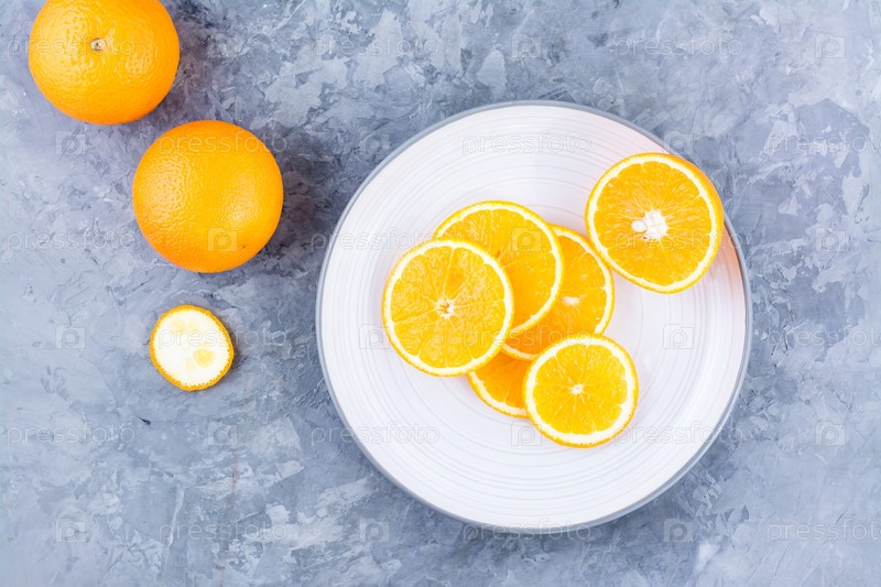Кусочки свежего апельсина на тарелке на столе. Витамины, диета и бодрость. Здоровое питание. Вид сверху