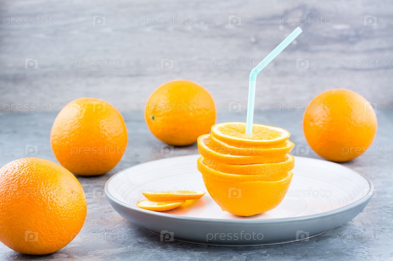 Свежие дольки апельсина в стопке и соломинка для напитка. Имитация апельсинового сока