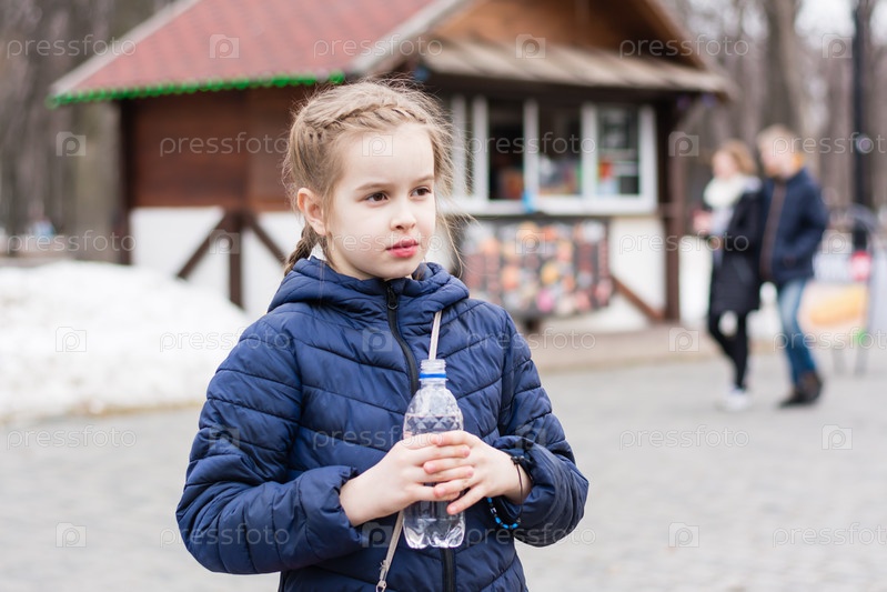 Милая девушка держит бутылку с питьевой водой на фоне фургона с едой в городском парке. Еда на вынос