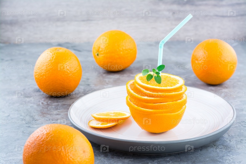Свежие апельсиновые дольки в стопке, листья мяты и соломинка для напитка. Имитация апельсинового сока
