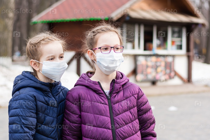 Две девушки в защитных масках в парке на расстоянии от фургона с едой. Еда на вынос