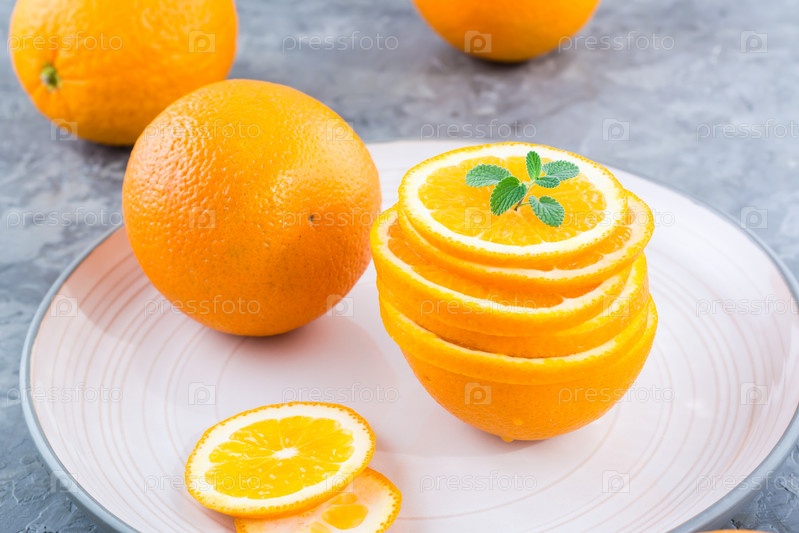 Свежие апельсиновые дольки в стопке и листья мяты на тарелке на столе. Здоровое питание