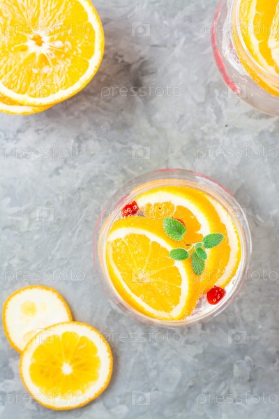 Крепкий зельтерский коктейль с апельсином, клюквой и мятой в стаканах на столе. Алкогольный сильногазированный напиток. Вертикальный и вид сверху