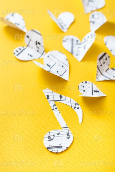 Музыкальные ноты, ключ и сердца, вырезанные из бумаги с музыкальным текстом на желтом фоне. Вертикальный вид