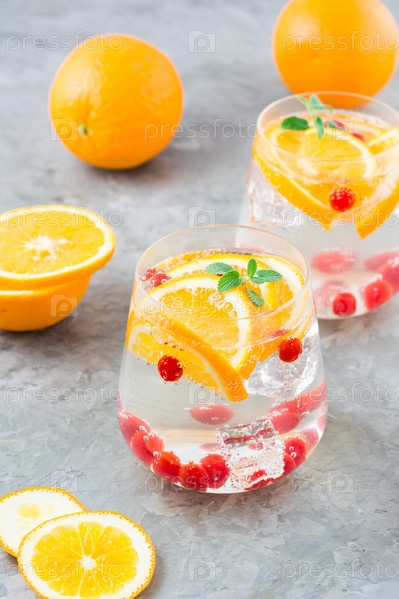 Крепкий зельтерский коктейль с апельсином, клюквой и мятой в стаканах и нарезанными апельсинами на столе. Алкогольный сильногазированный напиток. Вертикальный вид