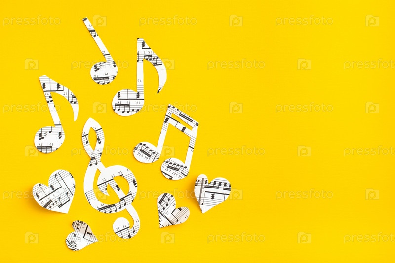 Музыкальные ноты, ключ и сердца, вырезанные из бумаги с музыкальным текстом на желтом фоне. Копировать пространство