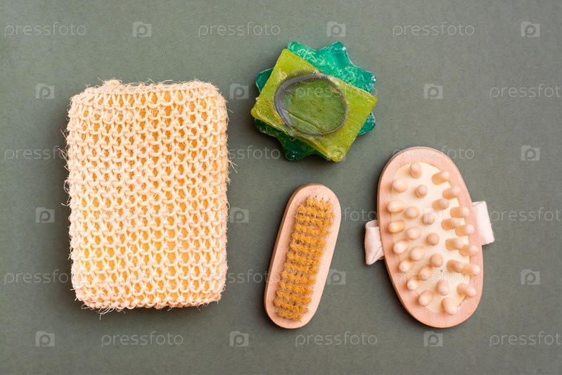 Уход за телом. Набор для ванной комнаты - мочалка, мыло, массажер и щетка на зеленом фоне