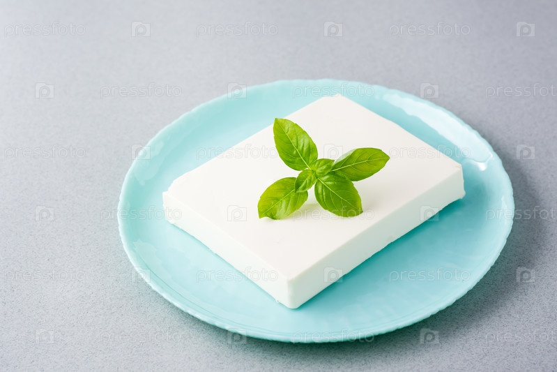 Кусок свежего сыра фета и листья базилика на тарелке на столе. Ингредиент для греческого салата