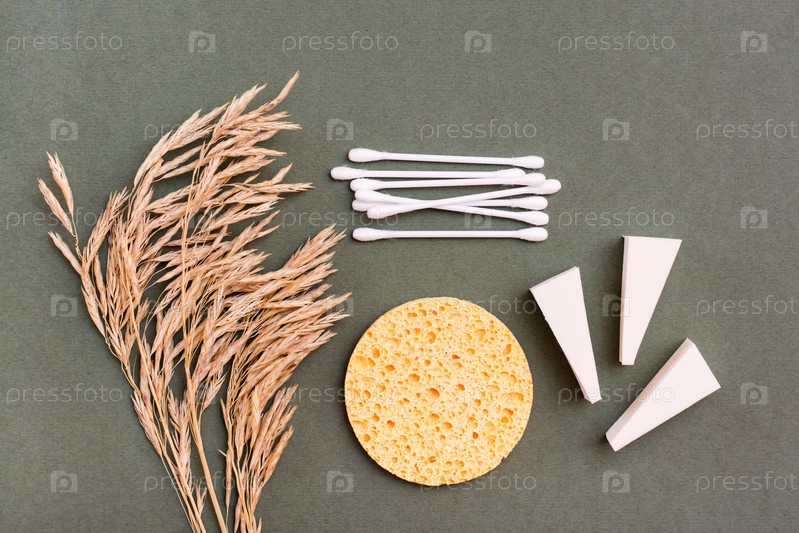 Предметы макияжа. Два типа губок, ватные тампоны и колосья травы на зеленом фоне
