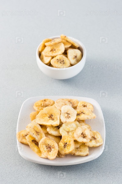 Запеченные банановые чипсы в белой миске и блюдце на столе. Быстрое питание. Веб-баннер. Вертикальный вид