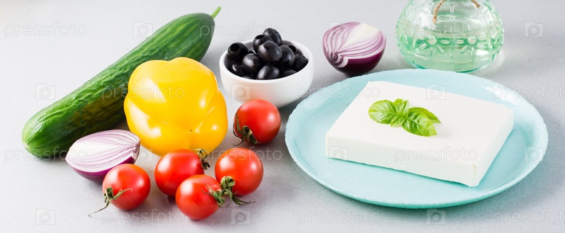 Свежие ингредиенты для домашнего греческого салата на столе. Домашняя жизнь. Веб-баннер