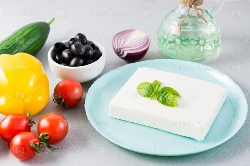 Свежие ингредиенты для домашнего греческого салата на столе. Домашняя жизнь. Крупный план