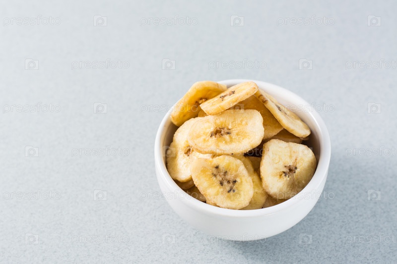 Запеченные банановые чипсы в белой миске на столе. Быстрое питание. Копировать пространство
