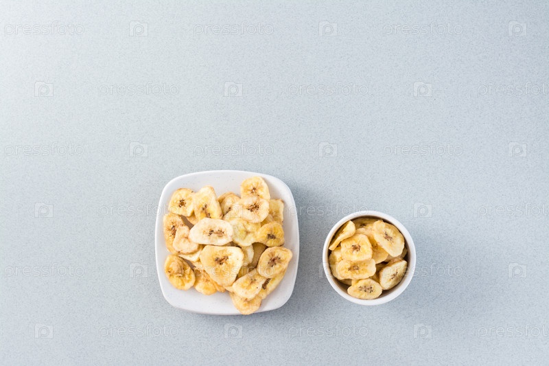 Запеченные банановые чипсы в белой миске и блюдце на столе. Быстрое питание. Веб-баннер. Вид сверху. Крупный план