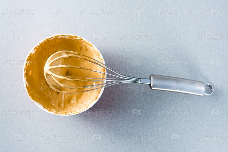 Создание пены для кофе далгона в миске и венчиком на сером фоне. Вид сверху