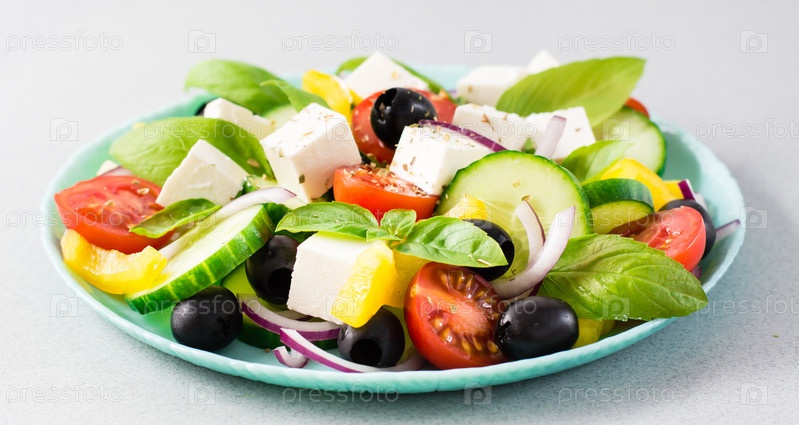 Свежий домашний греческий салат с листьями базилика на тарелке на столе. Домашняя жизнь. Веб-баннер