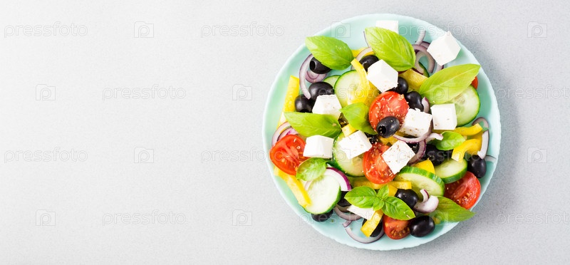 Свежий домашний греческий салат с листьями базилика на тарелке на столе. Домашняя жизнь. Вид сверху. Скопируйте пространство. Веб-баннер